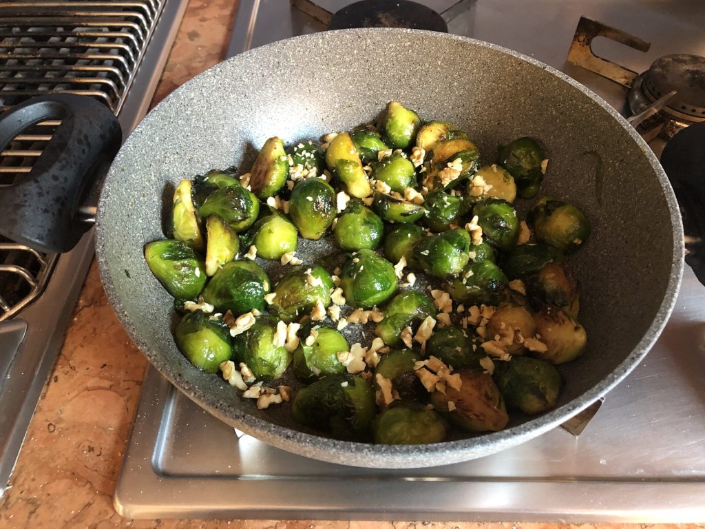 Finalmente, apaga el fuego y espolvoréalas con las nueces picadas de forma gruesa. Estas aportarán a vuestro plato un toque crujiente realmente agradable. Las coles de Bruselas con miel están listas para servir. ¡Disfrutad! Paola.