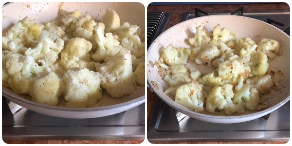Limpiar la coliflor eliminando las hojas y el tronco. Lavala muy bien bajo agua corriente, secarla con papel de cocina y dividirla en ramilletes. Cortad por la mitad los ramilletes más grandes.