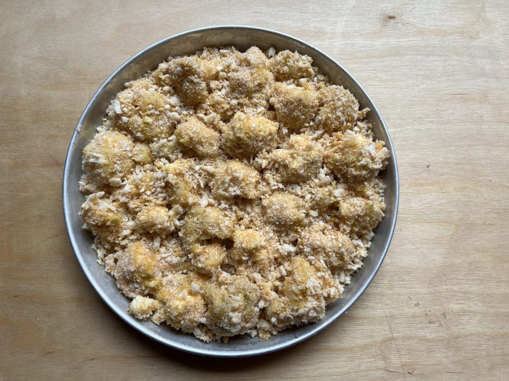 • A continuación, pasa cada ramito primero por el huevo y luego por el rebozado seco, presionándolos ligeramente en la mezcla para que se adhiera bien.
