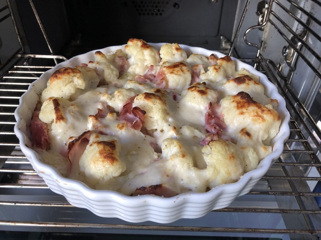 Luego, disponer dentro los ramilletes de coliflor alternándolos con lonchas de jamón cocido y trozos de brie (yo no quité la corteza). Salpimentar al gusto.
