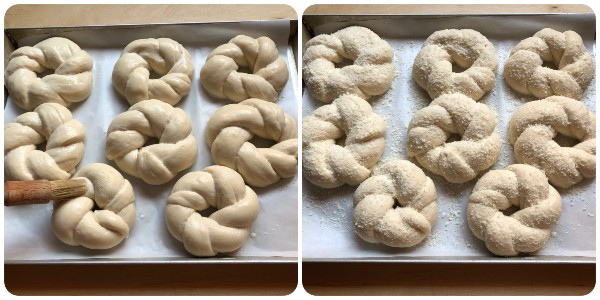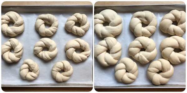 Colocar las coronas en la bandeja cubierta con papel de horno, cubrirlas con un paño y dejarlas levar otra horita.