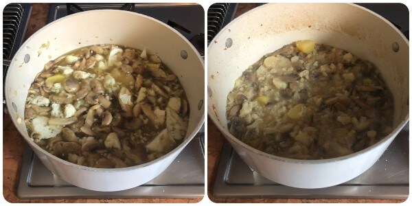 Dejar que chisporrotee por un instante y luego añadir la coliflor, los champiñones y las patatas.