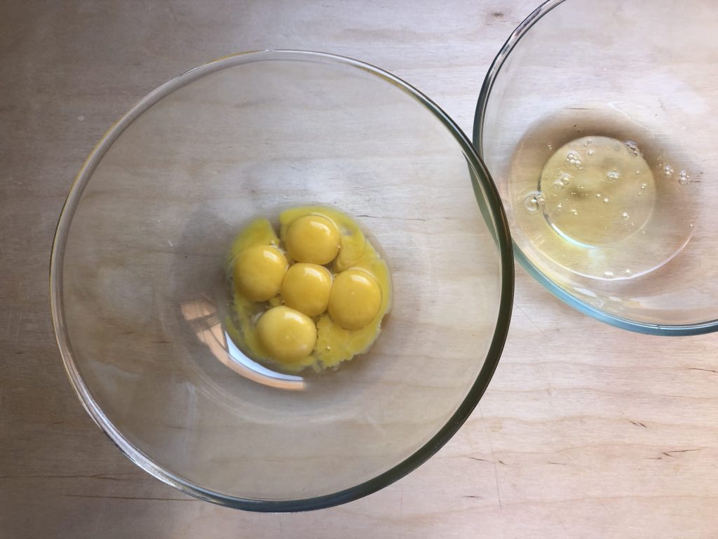 • Para empezar, separa las yemas de las claras. Te recomiendo poner las yemas en el bol más grande.
