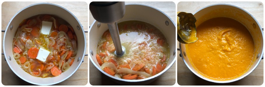 Luego añade las zanahorias y el jengibre, deja que se doren un par de minutos, después vierte el caldo caliente. Sala y añade pimienta al gusto.
