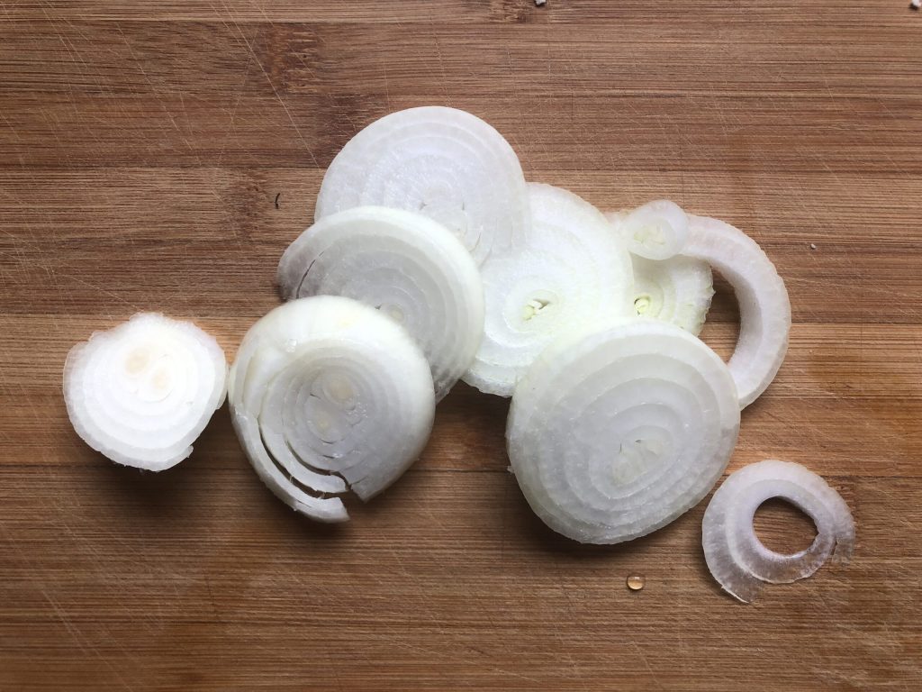 Pelar la cebolla y cortarla en rodajas.
