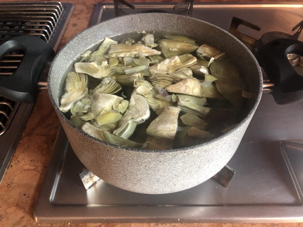 Mientras tanto, pelar el ajo, quitarle el germen central y picarlo finamente. Luego sofreírlo en unas cucharadas de aceite dentro de una sartén grande. Si no te gusta, puedes dejar el diente entero y retirarlo al final de la cocción. Dejarlo freír unos instantes, luego añadir los corazones de alcachofa bien escurridos.
