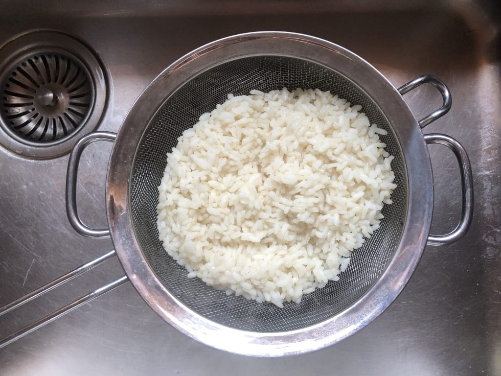 Hervir el arroz en abundante agua con sal hasta que esté bien cocido: tomará unos quince minutos. No debe estar al dente. Luego escurrirlo y dejarlo enfriar un poco.