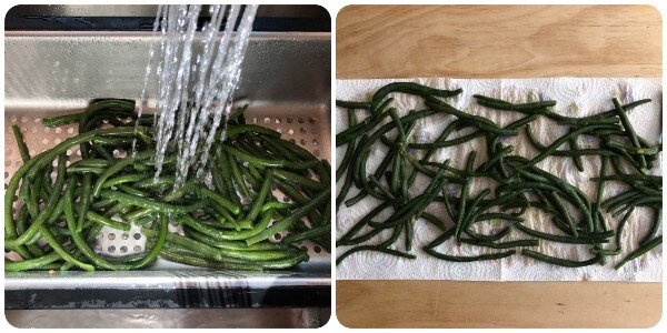 Escurrir las judías verdes y pasarlas bajo agua fría, luego extenderlas sobre un paño de cocina o papel de cocina.