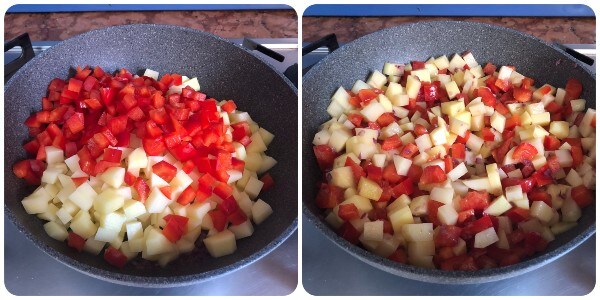 Cocinar a fuego medio-bajo durante unos 15 minutos, removiendo con frecuencia. Sazonar con sal y pimienta solo al final. Al final de la cocción, las verduras deben estar cocidas pero aún crujientes. En particular, las patatas no deben deshacerse. Apagar el fuego y dejar templar.
