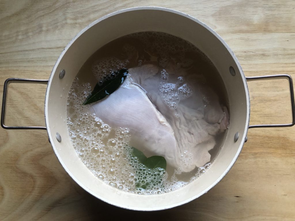 Poner la tapa y cocinar a fuego lento durante unas 2 horas (el líquido debe apenas hervir a fuego lento). Al finalizar la cocción, apagar el fuego y dejar enfriar la pechuga de pavo en el agua (de este modo absorberá perfectamente todos los aromas de la marinada).