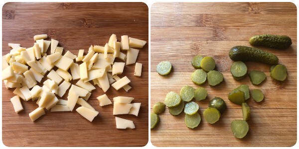 Corta en trozos pequeños el queso emmental y los pepinillos en vinagre en rodajas.