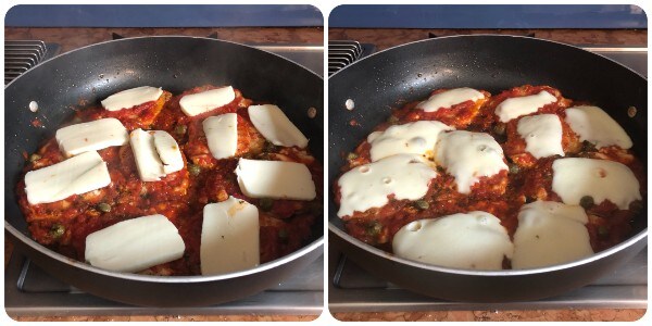 Colocar una rodaja de mozzarella sobre cada escalope, bajar el fuego, poner la tapa y cocinar hasta que el queso se haya derretido.
