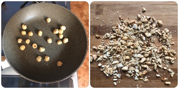 En una sartén pequeña, tostar las avellanas sin ningún condimento, luego picarlas groseramente con un cuchillo. Reservarlas porque servirán como guarnición final del plato.