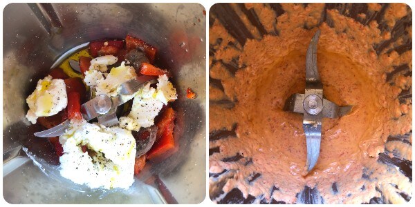 Ponerlos en una batidora, añadir los filetes de anchoa, la robiola, dos cucharadas de aceite y una abundante cantidad de pimienta negra recién molida. Batir todo hasta obtener una crema homogénea. Yo usé la Thermomix a velocidad 5/6 durante 15 segundos.