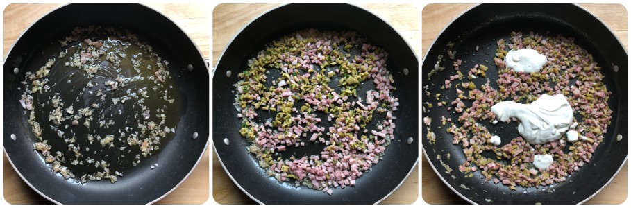 • Cuando empiece a chisporrotear, añadir también el jamón cocido y las aceitunas verdes picadas con el perejil y sofreír todo durante unos minutos.