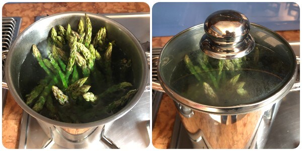 En una espárraguera (o en una olla alta y estrecha), llevar a ebullición abundante agua salada. Cuando hierva, sumergir los espárragos dejando fuera las puntas y cocerlos, con la tapa puesta, hasta que estén tiernos. El tiempo de cocción puede variar según el tamaño de tus espárragos.