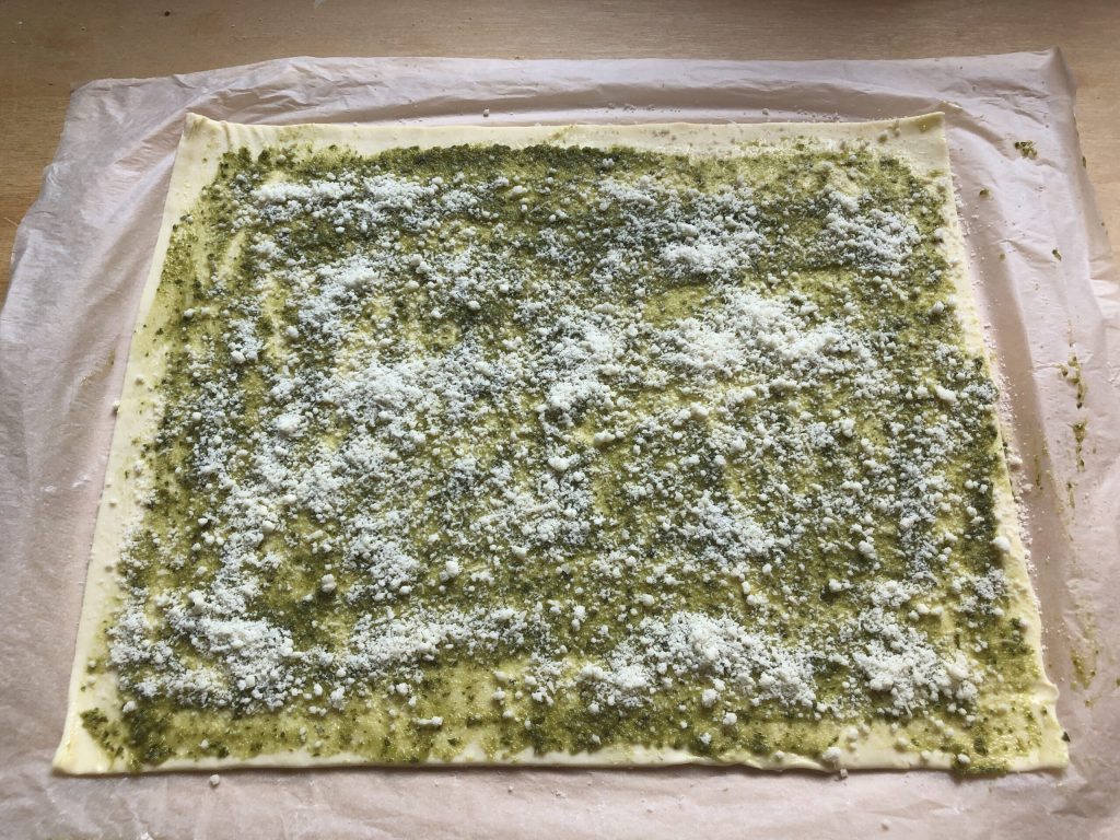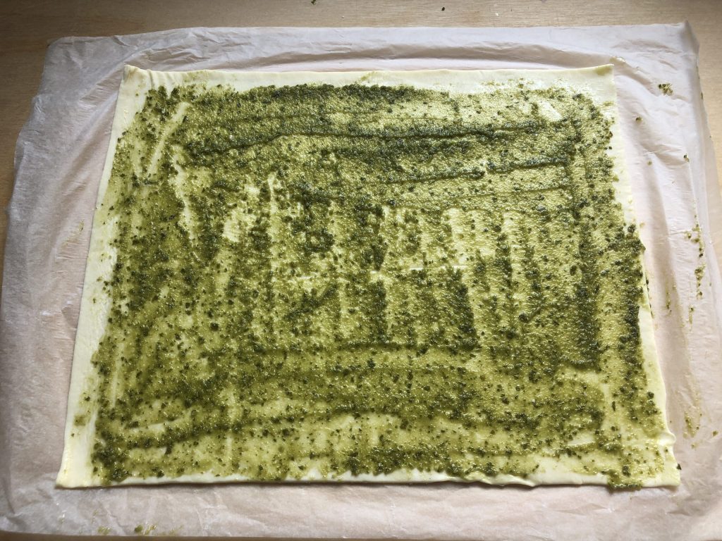 Desenrollar el hojaldre manteniéndolo sobre el papel de horno que viene en la caja y extender encima una capa delgada de pesto. Yo he preparado el pesto genovés con la Thermomix siguiendo la receta descrita AQUÍ.