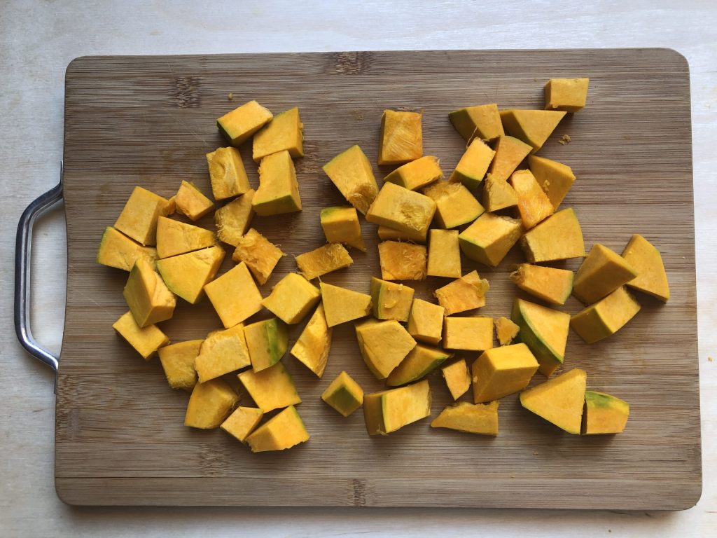 Mientras tanto, limpiar la calabaza eliminando la cáscara y todas las semillas internas. Lavarla, secarla tamponándola con papel de cocina y cortarla en trozos no demasiado grandes.