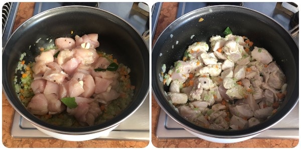 Luego añadir los trozos de pollo y dorarlos durante 5 minutos a fuego alto para sellar el exterior.