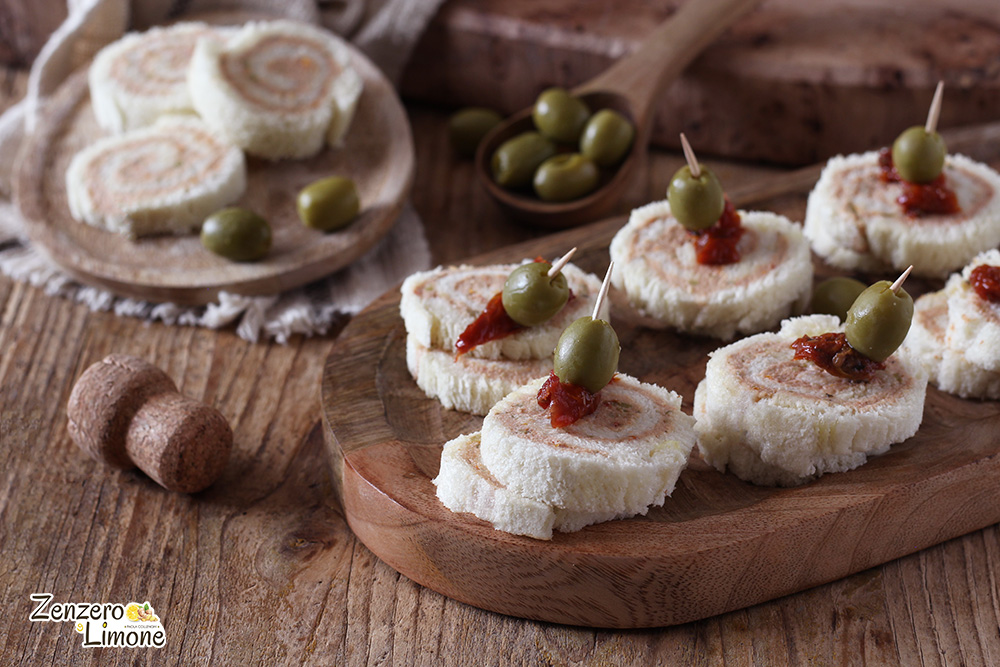 Finalmente, superponer dos rodajas entre sí ligeramente desfasadas y sujetarlas con un palillo en el que se haya insertado una aceituna verde y un trozo de tomate seco. Los falsos sándwiches están listos para ser servidos. Si los preparáis con algunas horas de antelación, conservadlos cubiertos en el frigorífico. ¡Disfrutad! Paola.