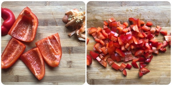 Limpiar el pimiento eliminando el tallo y todas las semillas y partes blancas internas. Lavarlo y cortarlo en dados.