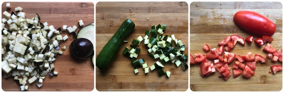 Limpiar la berenjena y los calabacines, lavarlos y cortarlos en dados.