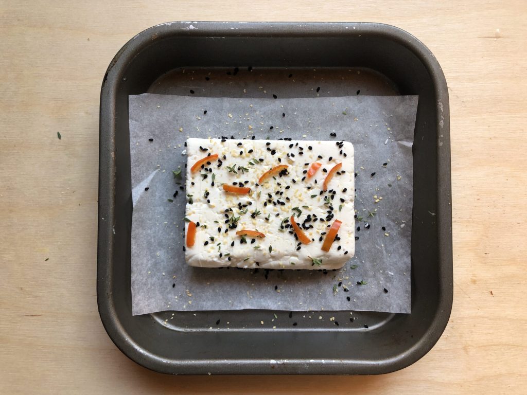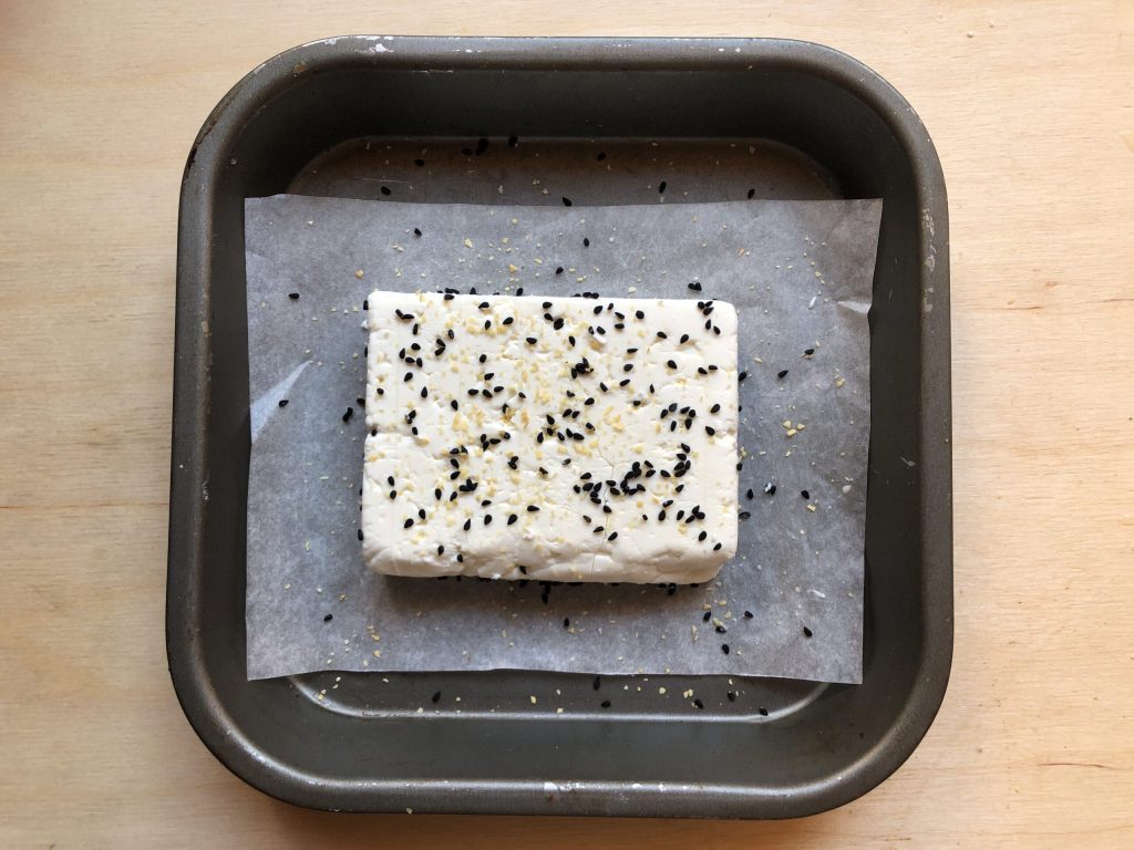 • Espolvorear con semillas de sésamo negro y ajo en polvo. He intentado que quedaran adheridas por todos los lados del queso, incluso abajo. Si no tienes semillas negras, puedes usar el más común sésamo blanco. La única diferencia será en el efecto cromático. Siendo la feta blanca, el sésamo negro queda mejor. Si deseas comprar el negro, puedes encontrarlo haciendo clic AQUÍ.
