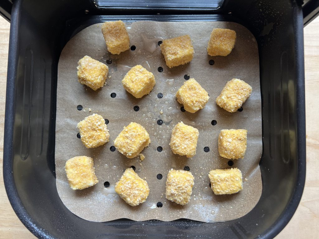 Disponer los bocaditos de feta en la cesta de la freidora de aire forrada con papel de horno perforado y pulverizarlos ligeramente con aceite. En este caso lo mejor es el aceite en spray. Si no tenéis, usad aceite y un pincel.