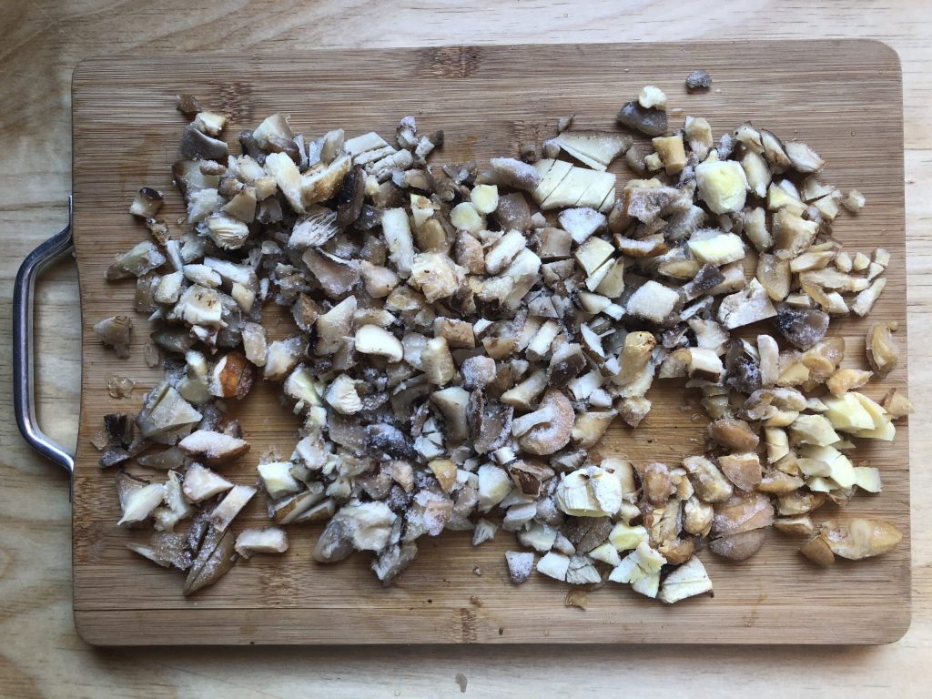 Cortar groseramente los champiñones congelados. Yo los pasé del congelador al frigorífico aproximadamente una hora antes de utilizarlos.