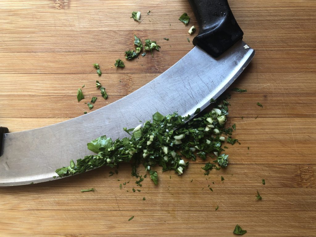 Lavar las hojas de perejil y picarlas junto con el diente de ajo pelado y sin el germen central.