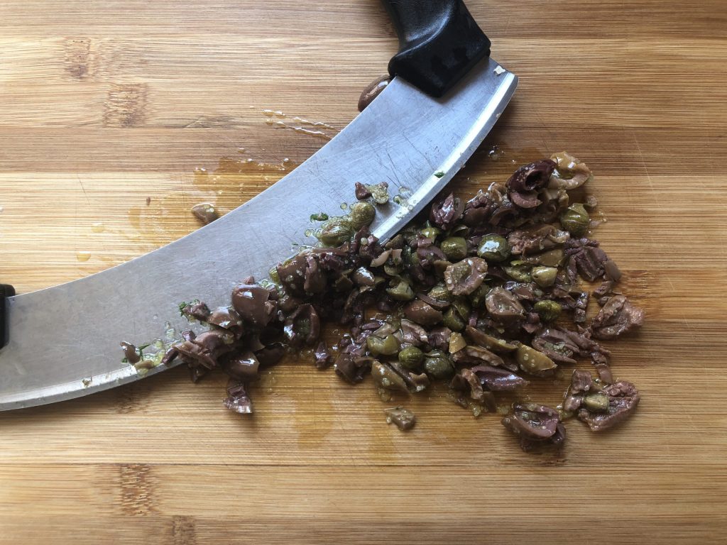 Picar las aceitunas taggiasche junto con las alcaparras.