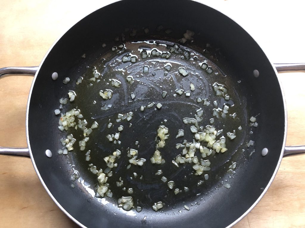 En una cazuela grande, calentar unas cucharadas de aceite y sofreír la cebolla y el ajo picados.