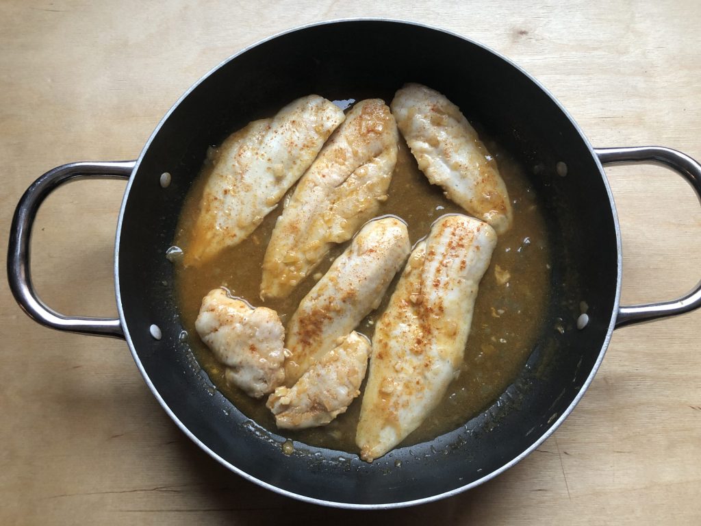 Después de los primeros 5 minutos de cocción, girar los filetes de merluza y verter en la cazuela la mezcla de almidón y agua.