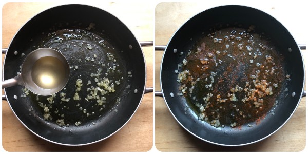 Dejarlos freír por un momento, luego verter medio cucharón de caldo caliente tomado del total y la paprika (puedes dosificarla al gusto según el gusto personal). Mezclar de inmediato durante unos segundos.