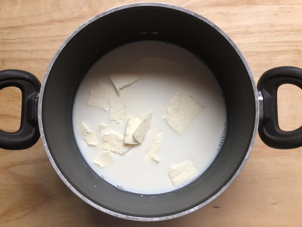 Verter la leche en una cazuela, añadir la mantequilla en trozos y una generosa pizca de sal y llevar al fuego.