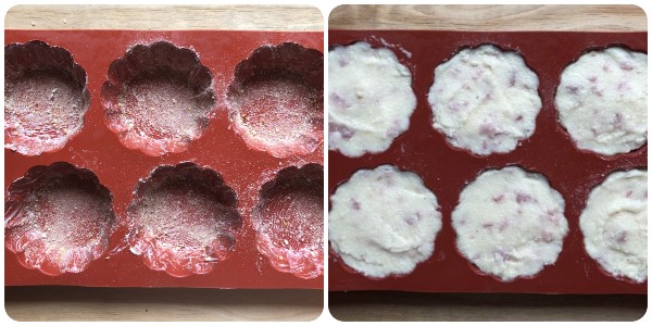 Engrasar unos moldes individuales y espolvorearlos con pan rallado, luego rellenarlos con la mezcla preparada nivelando la superficie. Si no tenéis un molde de este tipo y deseáis comprarlo, lo podéis encontrar haciendo clic AQUÍ. No es exactamente igual que el mío pero es muy similar.