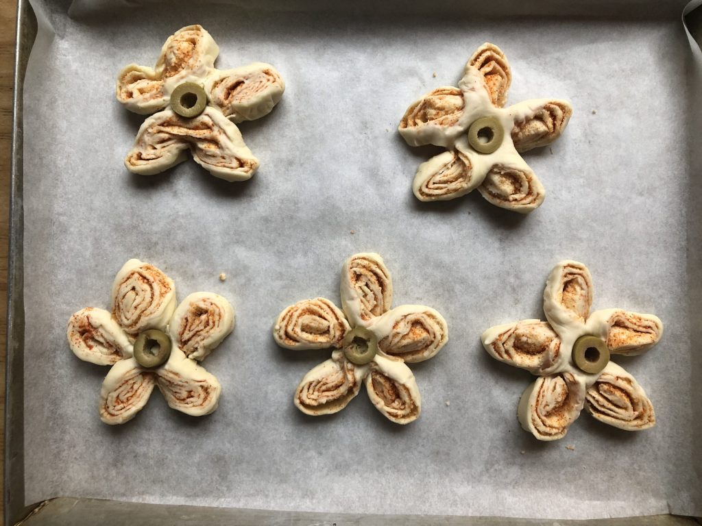 Abrir suavemente el hojaldre formando una flor y colocar en el centro de cada flor media aceituna verde.