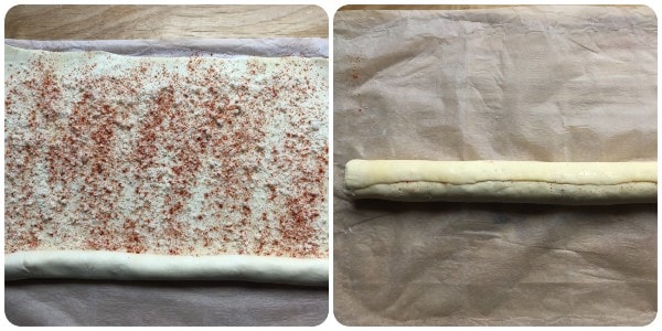 Luego enrollar el rectángulo empezando por el lado largo y sellar bien el extremo final presionando ligeramente con los dedos humedecidos. Envolverlo en el papel de horno proporcionado en el paquete y guardarlo en el frigorífico durante 15 minutos.