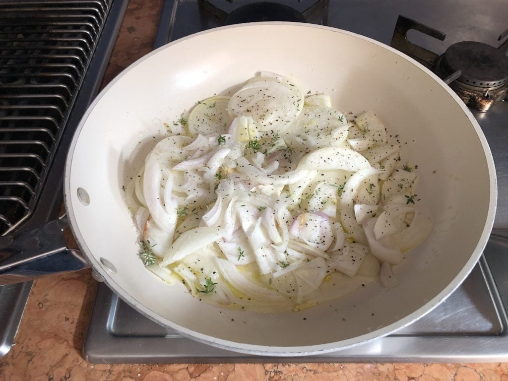 En una sartén, calentar dos cucharadas de aceite antes de añadir las cebollas junto con un par de cucharadas de agua. Salar y pimentar al gusto y aromatizar con las hojas de dos ramitas de tomillo.