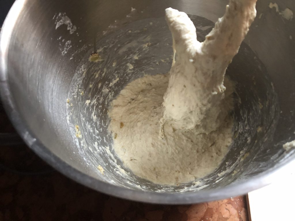Seguir amasando con el gancho hasta que todo el aceite se haya absorbido bien y la masa siga siendo muy pegajosa.
