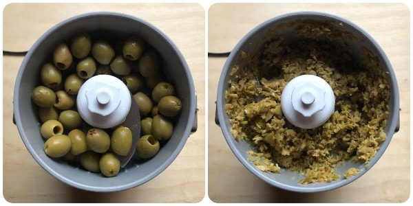 Poner las aceitunas verdes en una picadora y picarlas groseramente.