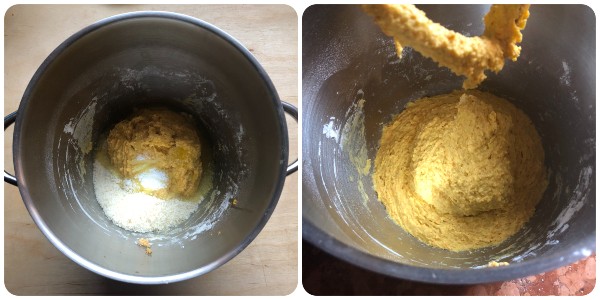 Luego vierte la mezcla de agua y calabaza y comienza a amasar con el gancho.