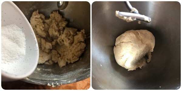 • Cuando la mezcla se haya compactado, añadir también la sal y continuar trabajando con el gancho hasta obtener una masa lisa y homogénea.