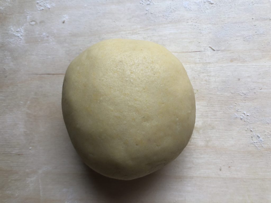 Transfiere la masa a la mesa y trabaja hasta que esté lisa y homogénea. Forma una bola, envuélvela en film transparente y déjala reposar en la nevera durante al menos una hora.