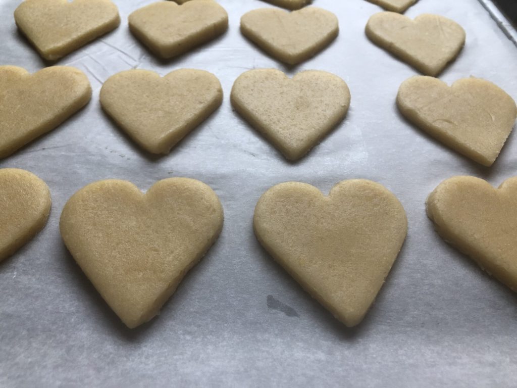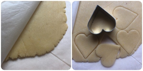 Pasado el tiempo de reposo, extiende la masa con el rodillo en una lámina de unos 3/4 mm de espesor (te recomiendo ponerla entre dos hojas de papel de horno) y corta las galletas. Yo hice corazones, pero puedes darles la forma que prefieras.