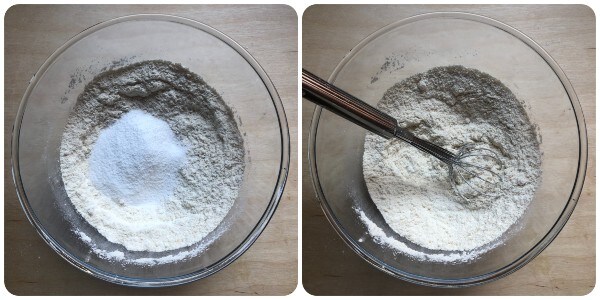 En un bol, pon la harina de almendra, la harina blanca, la vainillina, el azúcar glas, una pizca de sal y mezcla con un pequeño batidor de mano.