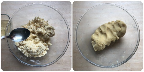 En este punto la masa podría quedar bastante desmenuzada. Entonces, añade la clara necesaria para que sea fácil de trabajar. Yo añadí en total 20 g de clara.