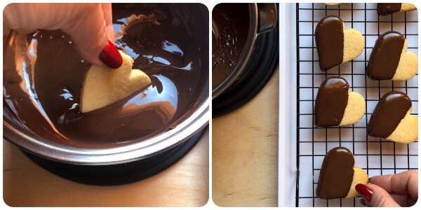 Cuando las galletas de almendra se hayan enfriado, sumérgelas por la mitad en el chocolate fundido, luego colócalas en una rejilla o en una hoja de papel de horno y déjalas secar perfectamente.