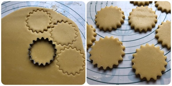 Ahora cortar círculos con un cortador ondulado de 9 cm de diámetro. Eliminar los recortes de masa y ponerlos a un lado porque se volverán a amasar hasta agotarlos. Si no tenéis este cortador y deseáis adquirirlo, lo podéis encontrar en línea haciendo clic AQUÍ.