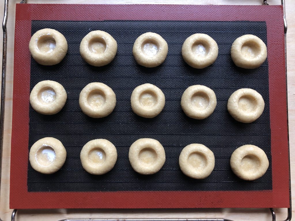 • Ahora practicad en el centro de cada bolita una cavidad. Yo usé la extremidad de un mortero que fui enharinando de vez en cuando para evitar que se pegara a la masa. Como alternativa podéis usar el fondo de un vasito.